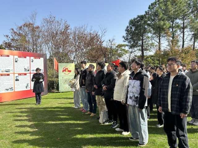 随后,全体人员前往书院烈士纪念碑。在庄严肃穆的氛围中,大家整队肃立,向革命烈士默哀致敬,表达对先烈们的深切悼念和崇高敬意。2025年上海市奖学金获得者陈诗婷作为代表,缓步上前,向革命烈士敬献花束,鲜花承载着全体人员对先烈们的无尽追思。大家纷纷表示,要传承先烈的英勇无畏精神,坚定理想信念,在新时代的伟大征程中,以实际行动为党和人民的事业添砖加瓦。
